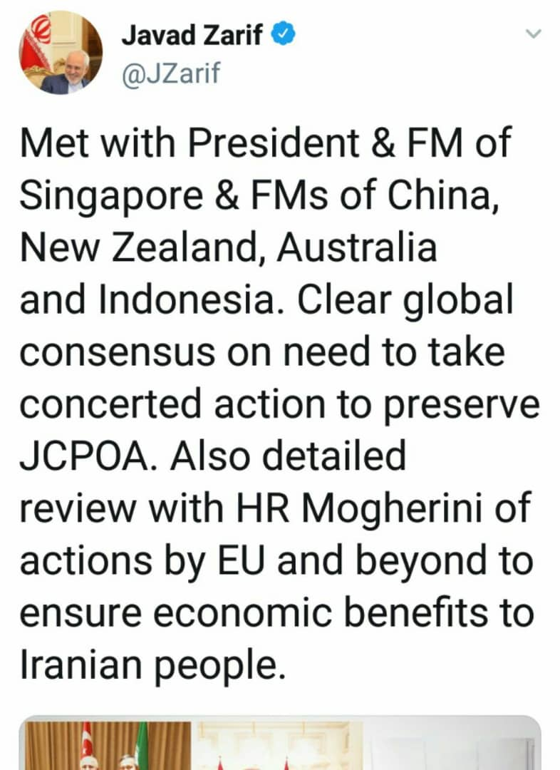 با رئیس جمهور و وزیر امور خارجه سنگاپور و وزرای خارجه چین، نیوزیلند، استرالیا و اندونزی دیدار کردم. اجماع جهانی روشنی در ضرورت انجام اقدامات هماهنگ برای حفظ برجام وجود دارد. با خانم موگرینی جزئیات اقدامات اتحادیه اروپا و دیگران برای اطمینان از بهره مندی اقتصادی مردم ایران از برجام را بررسی کردیم.