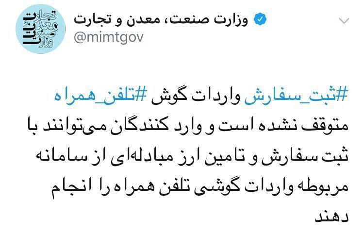 در واکنش به اخبار منتشر شده مبنی بر توقف ثبت سفارش گوشی تلفن همراه، وزارت صنعت، معدن و تجارت پیامی توئیتری منتشر کرد: