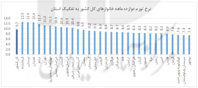 همچنین بیشترین نرخ تورم نقطه به نقطه مربوط به استان همدان (٢٣.٢ درصد) و کمترین آن هم مربوط به استان هرمزگان (١٤.٧ درصد) است. این یعنی خانوارهای ساکن استان همدان به طور متوسط ٣.٩ درصد بیشتر از میانگین کل کشور و خانوارهای ساکن استان هرمزگان به طور متوسط ٤.٦ درصد کمتر از میانگین کل کشور نسبت به مرداد ١٣٩٦ برای خرید یک «مجموعه کالا و خدمات یکسان» هزینه کردهاند. نرخ تورم دوازده ماهه منتهی به مرداد ماه ١٣٩٧ برای خانوارهای کشور به عدد ٩.٧ درصد رسید. بیشترین نرخ تورم دوازده ماهه مربوط به استان کرمانشاه (١٢.٥ درصد) و کمترین آن مربوط به استانهای بوشهر و سیستان وبلوچستان (٧.٤ درصد) است. شکاف نرخ تورم دوازده ماهه استانها در مرداد ماه ٥.١ درصد است که نسبت به ماه قبل ٠.٢ واحد درصد کاهش نشان میدهد.