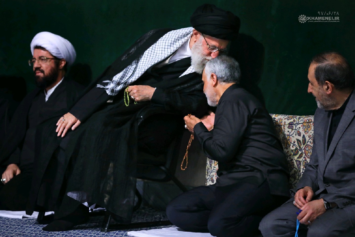 پایگاه اطلاع رسانی KHAMENEI.IR، تصویری را از بوسهی رهبر معظم انقلاب بر سر سردار سرلشکر حاج قاسم سلیمانی لحظاتی پیش از آغاز مراسم عزاداری شب عاشورا در حسینیه امام خمینی (ره) منتشر کرد.