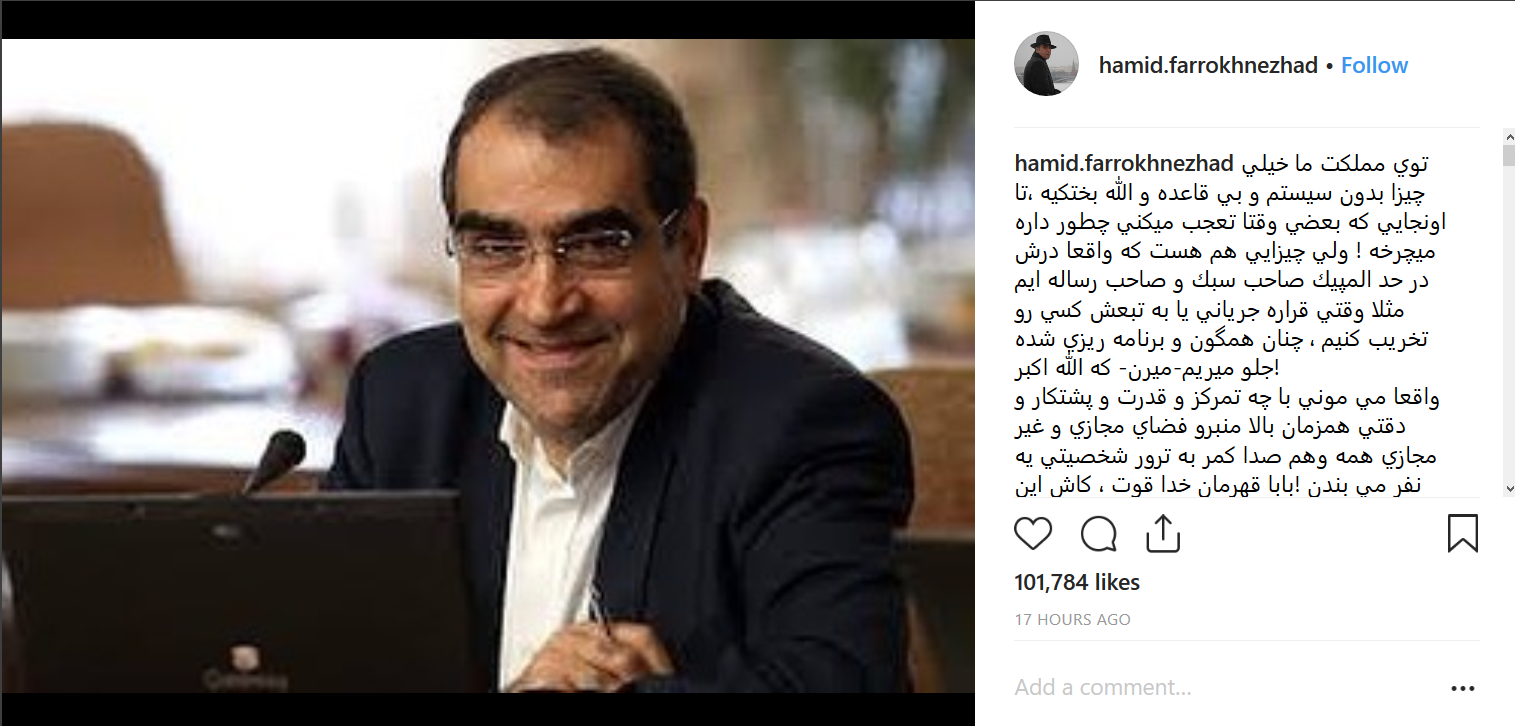 حمید فرخ نژاد در واکنش به انتقادات اخیرا از سیدحسن قاضی زاده وزیر بهداشت و درمان در اینستاگرام نوشت: «توی مملکت ما خیلی چیزا بدون سیستم و بی قاعده و الله بختکیه، تا اونجایی که بعضی وقتا تعجب میکنی چطور داره میچرخه! ولی چیزایی هم هست که واقعا درش و در حد المپیک صاحب سبک و صاحب رساله ایم مثلا وقتی قراره جریانی یا به طبعش کسی رو تخریب کنیم، چنان همگون و برنامه ریزی شده جلو میریم -میرن- که الله اکبر!