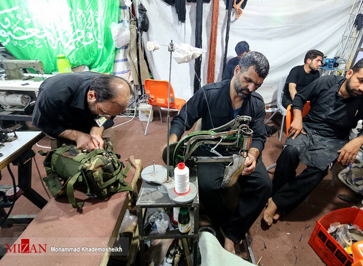 تصویری از یک موکبی متفاوت در شهر کربلا را مشاهده می کنید که در آن کیف و کفش زائران را تعمیر می‌کنند.