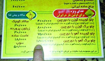 چلوکوبیده گوزن با دورچین ۴۰‌هزار تومان، چلوبرگ گوزن با دورچین ۸۰‌هزار تومان، چلوکوبیده آهو ۷۵‌هزار تومان و چلوبرگ آهو با دورچین ۱۰۰‌هزار تومان!