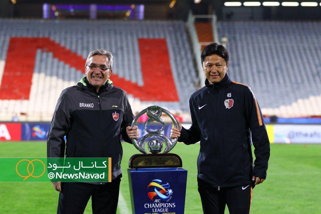 عکس یادگاری برانکو ایوانکوویچ و گو ایوا سرمربی دو تیم پرسپولیس و کاشیما با جام قهرمانی فینال آسیا در ورزشگاه آزادی