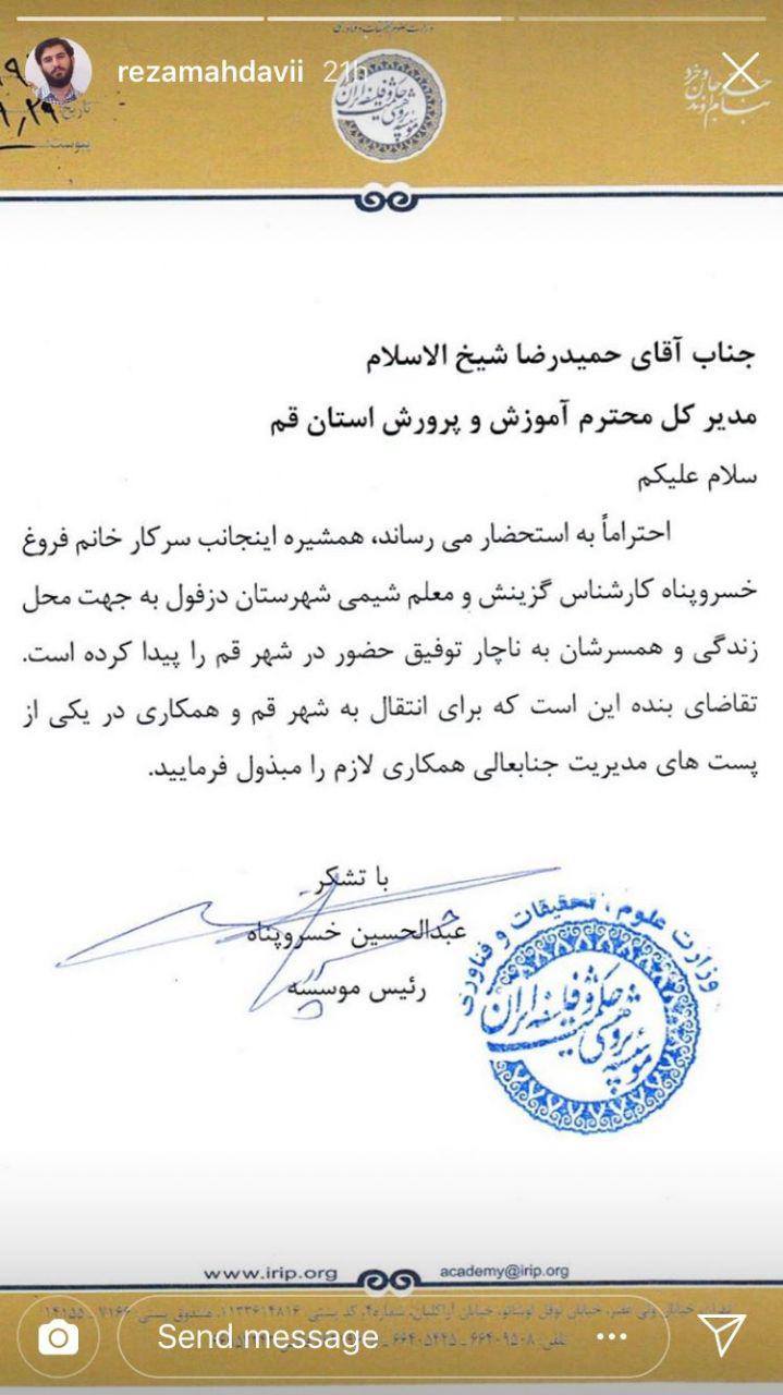 لطفا اگر نامه منتشره استاد خسروپناه صحت دارد، بفرمایید مانند سایرین از طریق روال قانونی مسیر انتقال را طی کنند تا حق معلمانی که برادر و عمه و خاله ای در قدرت ندارند، ضایع نشود.