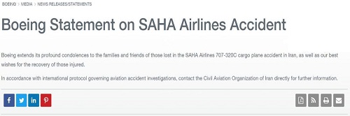 بویینگ عمیق ترین تسلیت های خود را برای کسانی که خانواده یا دوستان خود را در سانحه سقوط هواپیمای 707 هواپیمایی ساها از دست داده اند اند ارسال میکند و برای بهبود وضعیت مجروحین بهترینها را آرزو میکند.