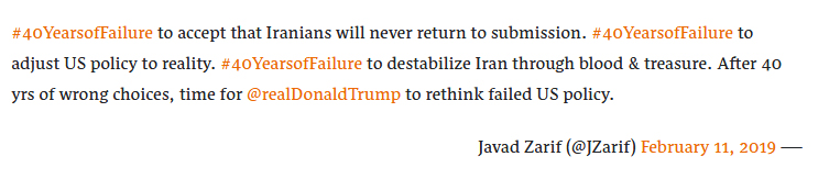 "محمد جواد ظریف" وزیر امور خارجه جمهوری اسلامی ایران که برای دیداری رسمی به لبنان سفر کرده است بلافاصله پس از پیام ترامپ در پاسخی توییتری نوشت:" چهل سال شکست در پذیرش این‌که ایرانیان هرگز به دوره تسلیم بازنخواهند گشت. در تطبیق سیاست آمریکا با واقعیت. چهل سال شکست در بی‌ثبات کردن ایران با خون و پول. پس از 40 سال انتخاب‌های اشتباه اینک وقت آن رسیده که دونالد ترامپ در سیاست‌های شکست خورده آمریکا در قبال ایران، بازنگری کند."