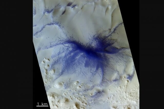 آژانس فضایی اروپا(EA) اخیراً تصاویر باورنکردنی از سطح مریخ شکار کرده است که یک عنکبوت مودار آبی رنگ را بر روی سطح سیاره سرخ نشان می‌دهد اما واقعاً این رگه‌های آبی روی مریخ چیست؟