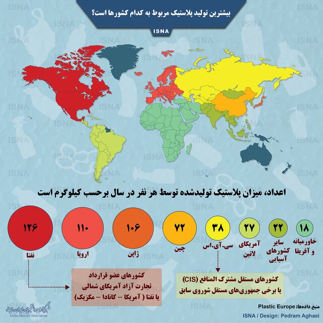 طبق آمار «Plastics Europe»، کشورهای عضو قرارداد تجارت آزاد آمریکای شمالی (نفتا) یعنی آمریکا، کانادا و مکزیک بیشترین پلاستیک را به ازای هر نفر تولید میکنند. پس از آن، کشورهای اروپایی و ژاپن در جایگاه دوم و سوم قرار دارند. ژاپن یکی از تولیدکنندگان و مصرفکنندگان اصلی پلاستیک و بستهبندیهای پلاستیکی است. میزان پلاستیک تولیدشده در ژاپن به ازای هر نفر بیشتر از چین یا دیگر کشورهای آسیایی است. در حالی که بیشتر پلاستیکهای تولیدشده در این کشور صادر میشوند، مقدار بسیار زیادی نیز در داخل ژاپن به مصرف میرسد.