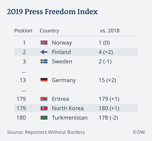 کشورهای نروژ، فنلاند و سوئد دارای بهترین وضعیت در زمینه آزادی رسانه هستند. در لیست گزارشگران بدون مرز سه کشور آخر آن را ترکمنستان در رتبه ۱۸۰، کره شمالی در رتبه ۱۷۹ و اریتره در رتبه ۱۷۸ تشکیل میدهند.
