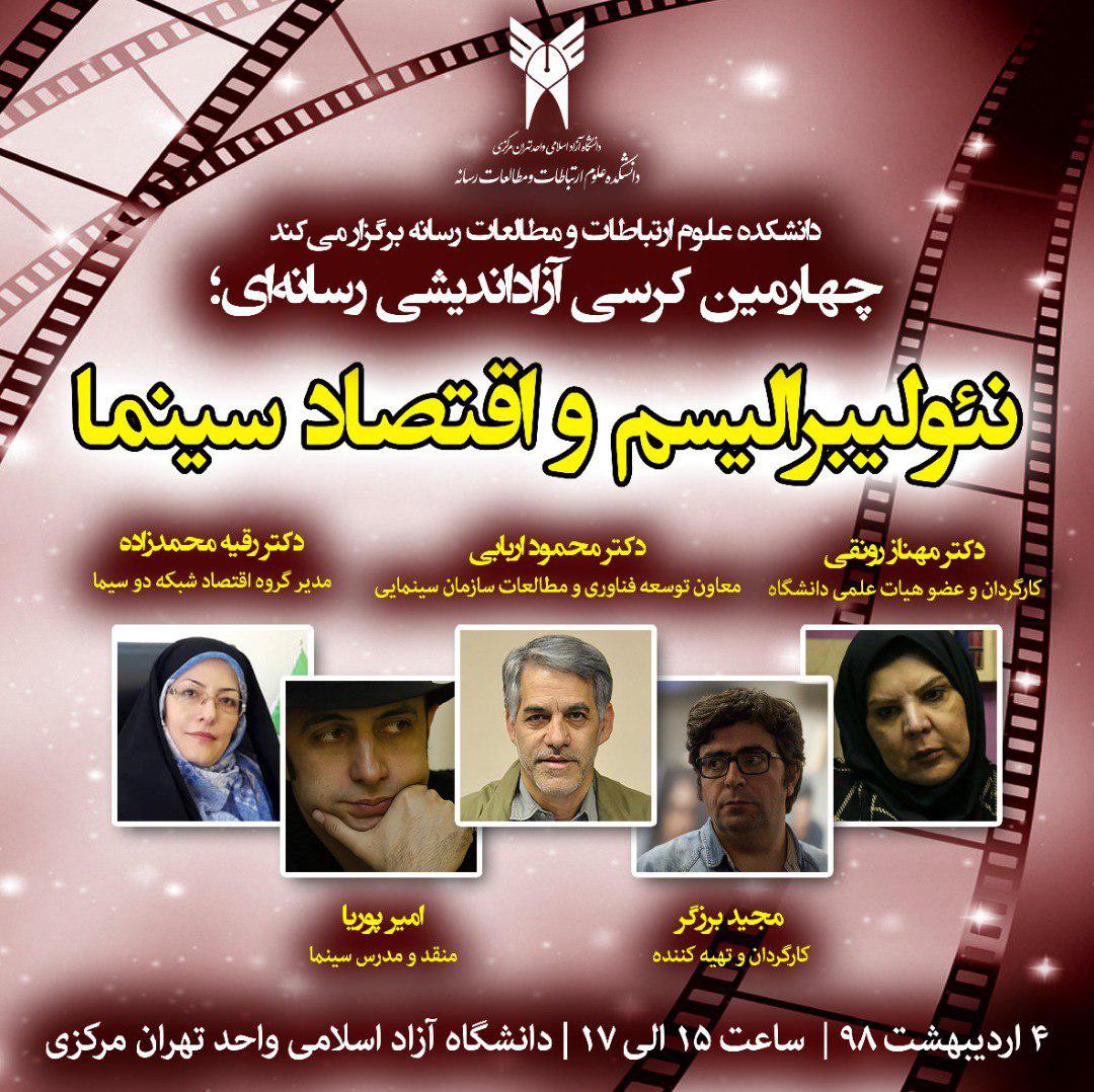 چهارمین نشست "کرسی آزاد اندیشی رسانه ای" با عنوان " نئولیبرالیسم و اقتصاد سینما " ساعت ۱۵ تا ۱۷چهارشنبه ۴ اردیبهشت ۹۸ در سالن غدیر دانشگاه آزاد اسلامی واحد تهران مرکزی " برگزار می شود.