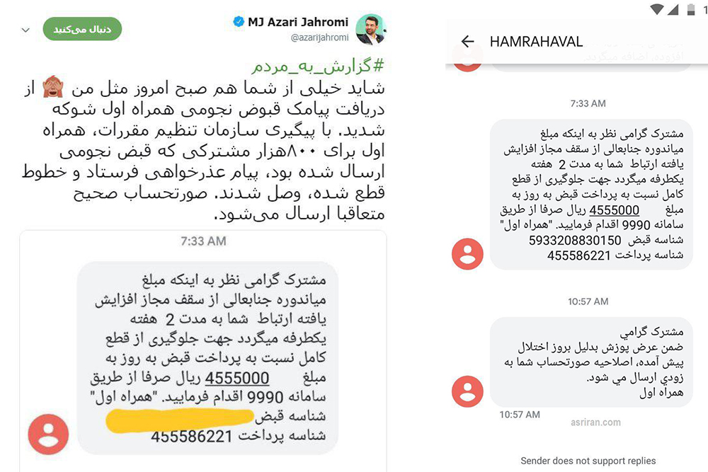 وزیر ارتباطات در واکنش به پست تلگرامی عصر ایران درباره اشتباه و عذرخواهی همراه اول در صدور صورتحساب مشترکین در توییتر نوشت: