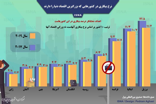 در این اینفوگرافی نرخ بیکاری سال‌های ۲۰۱۷ و ۲۰۱۹ در کشور‌های پیشروی اقتصاد جهانی به نمایش درآمده و مقایسه شده است.