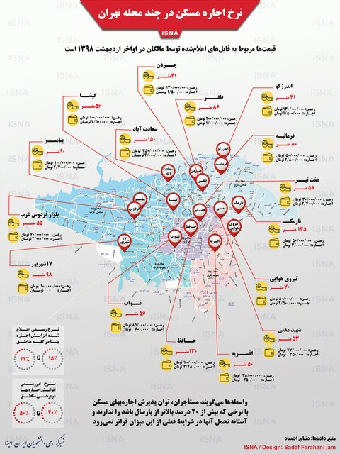 در گزارشی که روزنامه دنیای اقتصاد درباره قیمت فایلهای اعلام شده توسط مالکان در اواخر اردیبهشت ۱۳۹۸ منتشر کرده، متراژ واحدها، نرخ اجاره و نرخ رهن در برخی از محلههای تهران مورد برسی قرار گرفته است. در این اینفوگرافی به منتخبی از این اعداد و ارقام در چند منطقه تهران پرداخته شده است.