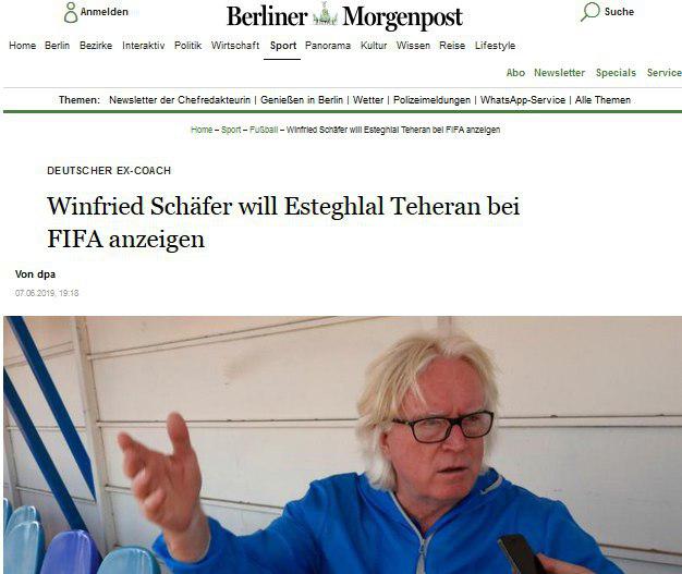 اما این مربی آلمانی پس از چند هفته انتظار به این خواسته نرسید و در پایان هفته گذشته اعلام کرد برای دریافت حق و حقوقش به فیفا شکایت میکند. این موضوع در یک رسانه آلمانی نیز بازتاب داشت. سایت مورگن پست آلمان به نقل از DPA خبر شکایت وینفرد شفر از باشگاه استقلال به دلیل آنچه که او نقض قوانین خوانده است، را منتشر کرد.