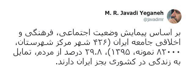 جوادی یگانه معاون فرهنگی شهرداری تهران و استادجامعه شناسی دانشگاه تهران در توئیتر نوشت: بر اساس پیمایش وضعیت اجتماعی، فرهنگی و‌ اخلاقی جامعه ایران (۴۲۶ شهر مرکز شهرستان، ۸۲۰۰۰ نمونه، ۱۳۹۵)، ۲۹.۸ درصد از مردم، تمایل به زندگی در «کشوری بجز ایران» دارند.