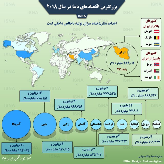 در این رتبهبندی، ایران با تولید ناخالص داخلی به ارزش بیش از ۴۵۴ میلیارد دلار، بالاتر از کشورهایی، چون نروژ، امارات و ایرلند و پایینتر از کشورهایی، چون اتریش، بلژیک و سوئد در رده ۲۷ بزرگترین اقتصادهای جهان ایستاده است.