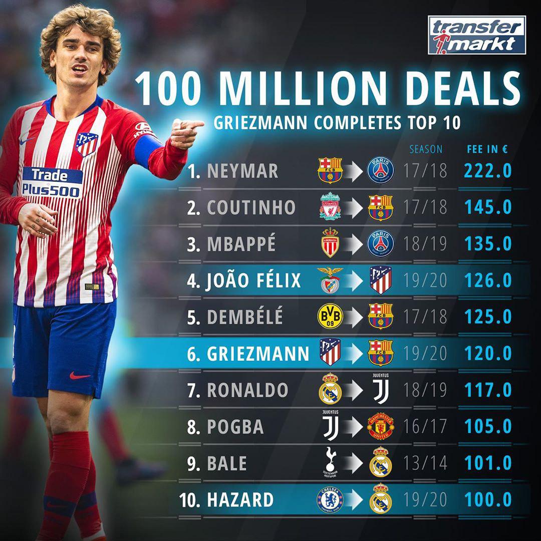 انتقال 135 میلیون یورویی امباپه از موناکو به پاری سن ژرمن در سال 2018، انتقال 126 میلیون یورویی ژائو فیلیکس از بنفیکا در اتلتیکو مادرید در تابستان جاری و انتقال 125 میلیون یورویی عثمان دمبله از بروسیا دورتموند به بارسلونا در رده های سوم تا پنجم این لیست قرار دارد.
