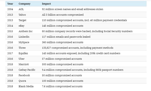 بر اساس جدول زیر، بالغ بر ۹۳ میلیون حساب کاربری پست الکترونیکی و نام کاربری در شرکت AOL در سال ۲۰۰۴ میلادی توسط هکرها و مجرمان سایبری به سرقت رفت.