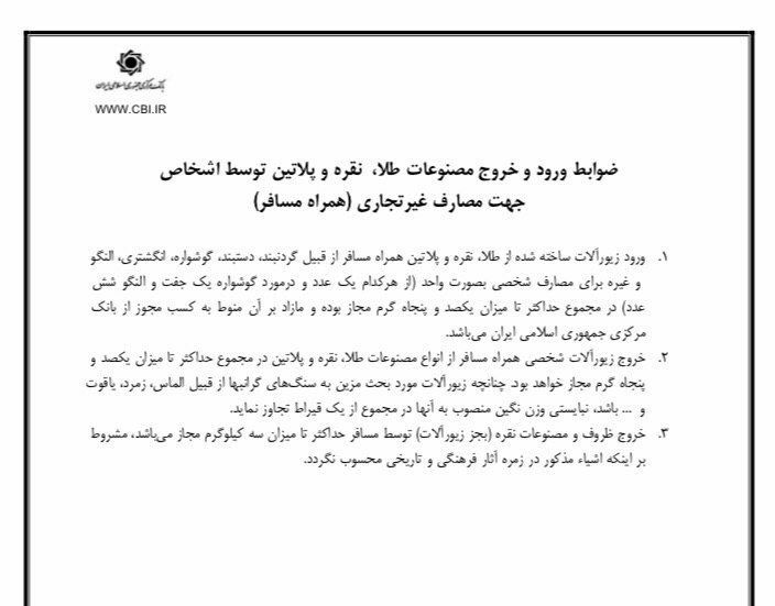 ۱. ورود زیورآلات ساخته شده از طلا، نقره و پلاتین همراه مسافر از قبیل گردنبند، دستبند، گوشواره، انگشتری، النگو و غیره برای مصارف شخصی به صورت واحد (از هر کدام یک عدد و در مورد گوشواره یک جفت و النگو شش عدد) در مجموع حداکثر تا میزان ۱۵۰ گرم مجاز بوده و مازاد بر آن منوط به کسب مجوز از بانک مرکزی جمهوری اسلامی ایران است.