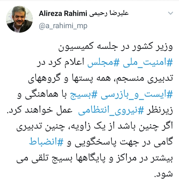 به گزارش عصرایران، علیرضا رحیمی در صفحه شخصی خود در توییتر نوشت: وزیر کشور در جلسه کمیسیون ⁧امنیت ملی⁩ ⁧مجلس⁩ اعلام کرد در تدبیری منسجم، همه پست‌ها و گروه‌های ⁧ایست و بازرسی⁩ ⁧بسیج⁩ با هماهنگی و زیرنظر ⁧نیروی انتظامی⁩ عمل خواهند کرد.