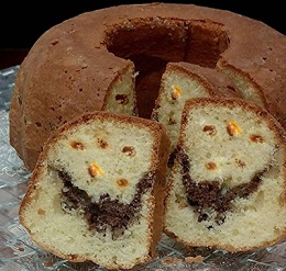 یکی دو قاشق از مایه را کاکائو اضافه می کنیم. روی مایه ساده مایع کاکائویی را می ریزیم و گردو و کشمش یا خلال بادام بوداده شده می پاشیم و بعد بقیه مایع سفید را روی آن می ریزیم و روی کیک گردو و کشمش می پاشیم (کشمشی که خیسانده و در پارچه خشک کرده و در آرد غلتانده شده و بعد الک کرده که سنگین نشه که بره ته کیک) و داخل فر با حرارت ١٨٠ درجه حدود ٤٠ دقيقه گذاشتم.