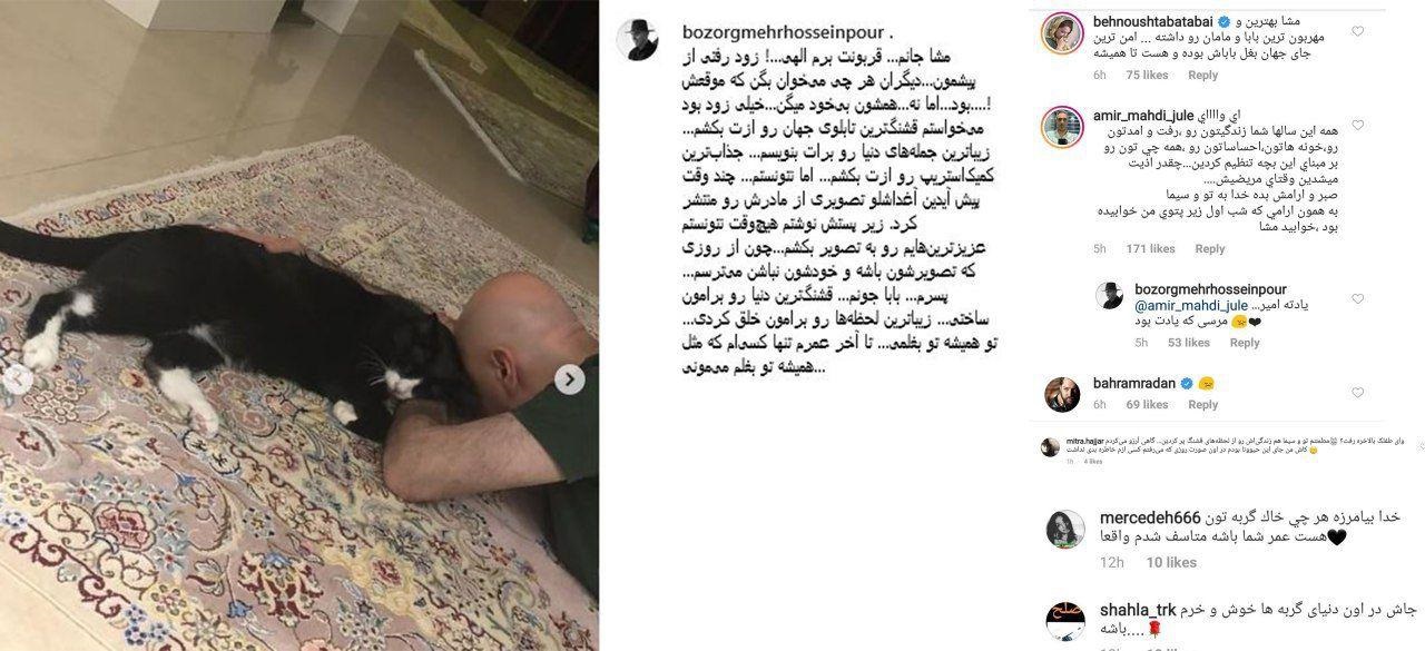 مرگ گربه بزرگمهر حسین پور و همدردی بازیگران (+عکس)