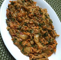 بادمجان ها را سرخ كنيد سپس هويج ها را رنده کنید و به بادمجان ها اضافه کنید جعفری خرد شده و سير له شده را با آب ليموترش و سس فلفل تند و بعد از آن نمک، سركه، رازيانه اضافه کنید و هم بزنید تا خوراک جا بیفتد.
