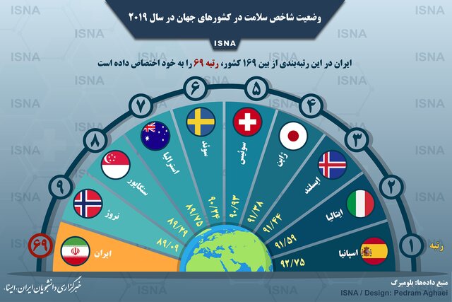 بلومبرگ تازهترین گزارش خود درباره موضوع سلامت در سال ۲۰۱۹ را بهتازگی منتشر کرده و در آن، کشورهای جهان را بر حسب شاخصهای سلامت - بر اساس دادههای ثبتی سازمان بهداشت جهانی و بانک جهانی - رتبهبندی کرده است. در اینفوگرافی پیش رو به ۹ کشور نخست این رتبهبندی و وضعیت ایران پرداخته شده است.