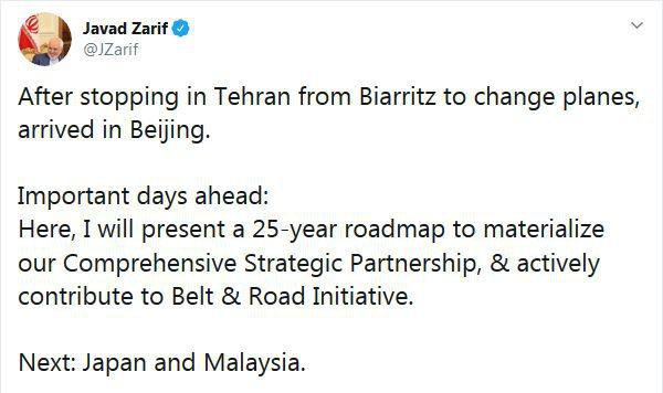 روزهای مهمی پیش رو است: من در اینجا یک نقشه راه ۲۵ ساله برای عملی کردن شراکت راهبردی جامع بین ایران و چین و نقش‌آفرینی فعال در ابتکار یک پهنه - یک راه ارائه خواهم کرد‌. ایستگاه‌های بعد: ژاپن و مالزی."