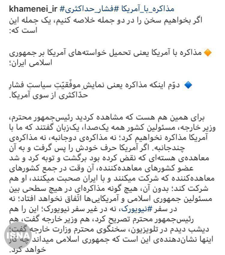 پست تازه صفحه اینستاگرام مقام معظم رهبری درباره مذاکره با آمریکا