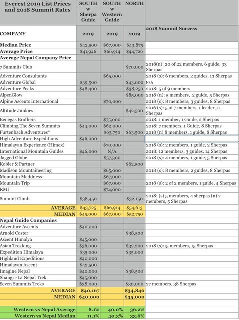 * جدول شرکت ها ارائه دهنده تور به اورست و مقایسه آن با سال  ۲۰۱۸