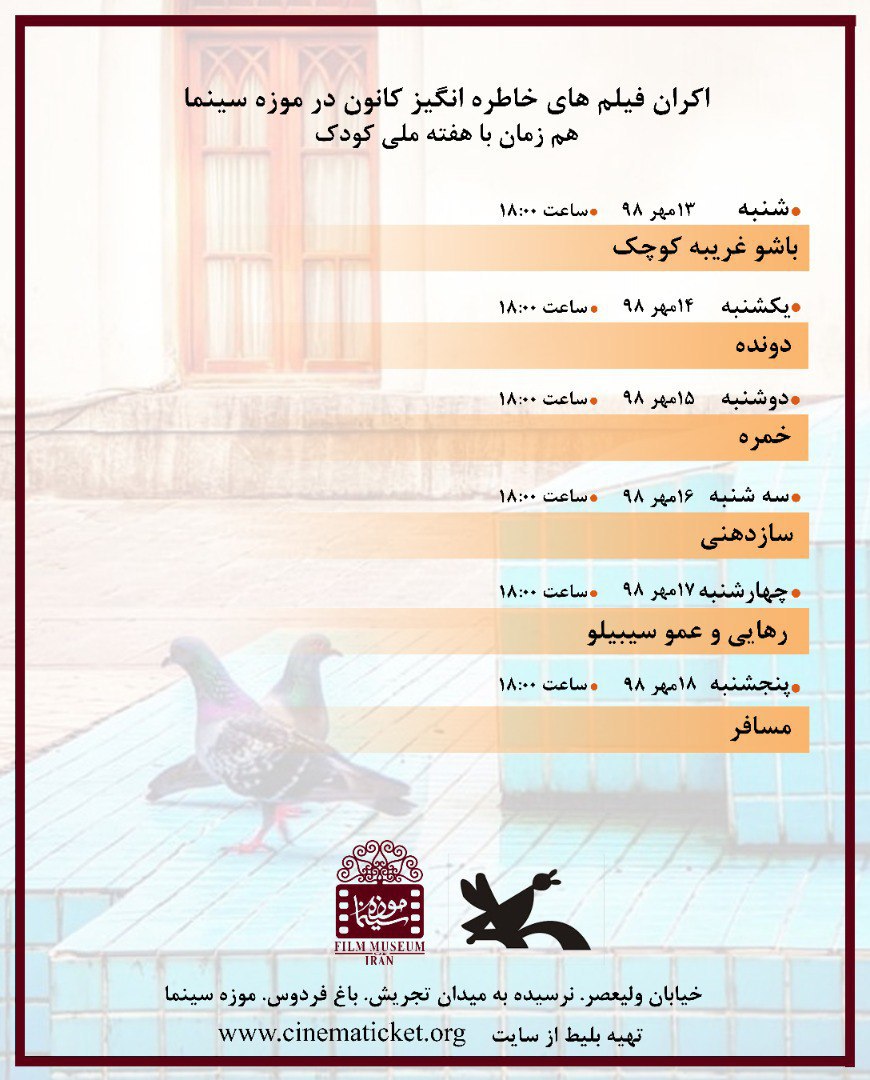 فیلم‌های «باشو غریبه کوچک» شنبه ۱۳ مهرماه، «دونده» یکشنبه ۱۴ مهرماه، «خمره» دوشنبه ۱۵ مهرماه، «ساز دهنی» سه‌شنبه ۱۶ مهرماه، «رهایی» چهارشنبه ۱۷ مهرماه، «عمو سیبیلو» چهارشنبه ۱۷ مهرماه و «مسافر» پنجشنبه ۱۸ مهرماه در موزه سینما به نمایش در می‌آید.
