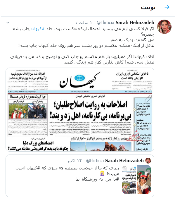 سارا حلم زاده، یکی از تماشاگران بازی ایران-کامبوج در ورزشگاه آزادی که کیهان دو روز پیاپی عکس وی را با عنوان "قربانیان آزادی" در صفحه اول منتشر کرد، در توئیتر خطاب به کیهان نوشت: "بگذار کنار هم زندگی کنیم".