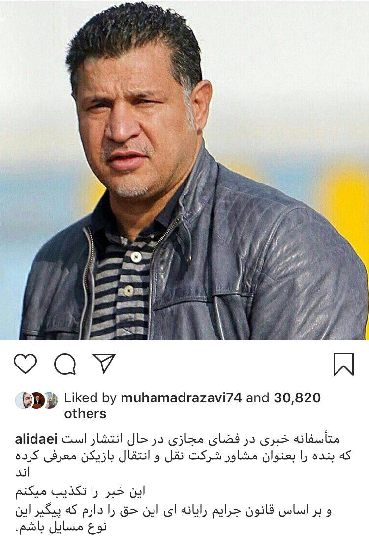به گزارش عصرایران، علی دایی سرمربی سابق تیم سایپا که در لیگ جدید هدایت تیمی را برعهده ندارد، با انتشار پستی در صفحه اینستاگرامش هرگونه فعالیت در حوزه نقل و انتقالات و جا به جایی بازیکن را تکذیب کرد.