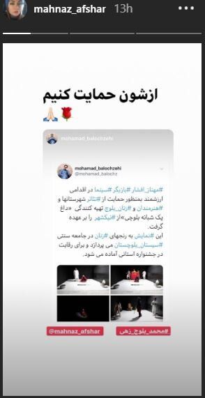 به گزارش عصرایران، این بازیگر در اینستاگرام خود توئیت یک هنرمند سیستانی را بازنشر کرد که نوشته: «مهناز افشار، بازیگر سینما در اقدامی ارزشمند به منظور حمایت از تئاتر شهرستانها، هنرمندان و زنان بلوچ تهیهکنندگی «داغ یک شبانه بلوچی» از نیکشهر را برعهده گرفت. این نمایش به رنجهای زنان در جامعه سنتی سیستان و بلوچستان میپردازد و برای رقابت در جشنواره استانی آماده میشود.»