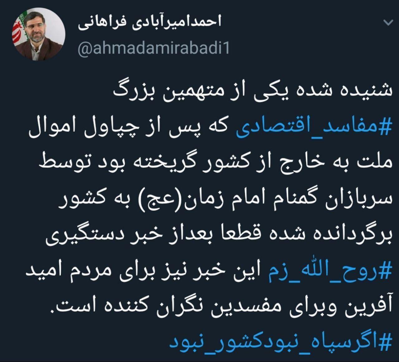 امیرآبادی عضو هیات مجلس شورای اسلامی از بازداشت یک متهم بزرگ اقتصادی در خارج از کشور خبر داد.