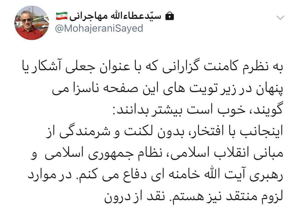 عطاء الله مهاجرانی نوشت: اینجانب با افتخار از رهبری آیت‌الله خامنه‌ای دفاع می‌کنم.