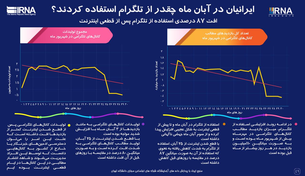 استفاده از تلگرام در آبان ماه و تا پیش از قطعی اینترنت به شکل عجیبی افزایش پیدا کرده و از سوم آبان ماه جهشی ناگهانی داشته است. اما با قطع شدن اینترنت از ۲۵ آبان، استفاده از تلگرام به شدت کاهش یافته به نحوی که استفاده از آن به صورت میانگین ۸۷ درصد در مقایسه با روزهای قبل کاهش داشته است.