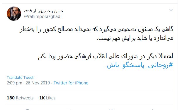 به گزارش ایسنا، این عضو شورای عالی انقلاب فرهنگی با انتشار یادداشتی در صفحه توییتر خود نوشت:"گاهی یک مسئول تصمیمی می‌گیرد که نمی‌داند مصالح کشور را به‌خطر می‌اندازد یا شاید برایش مهم نیست. احتمالا دیگر در شورای عالی انقلاب فرهنگی حضور پیدا نکنم. #روحانی_پاسخگو_باش"