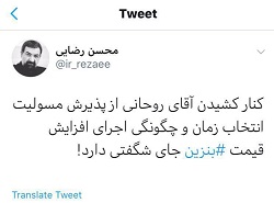 محسن رضایی دبیر مجمع تشخیص مصلحت نظام در واکنش به اظهارات روز گذشته رئیسجمهور در جریان سفر به آذربایجان شرقی که درباره زمان اجرای طرح سهمیهبندی و افزایش قیمت بنزین ابراز بیاطلاعی کرده بود، در صفحه شخصی خود در توییتر نوشت: "کنار کشیدن آقای روحانی از پذیرش مسولیت انتخاب زمان و چگونگی اجرای افزایش قیمت بنزین جای شگفتی دارد!"