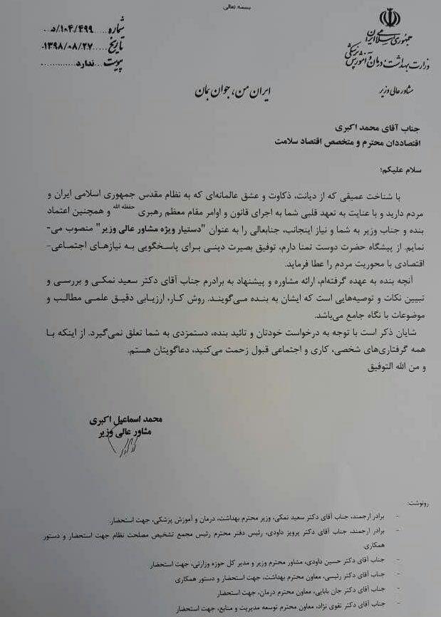 به گزارش عصر ایران، محمد اسماعیل اکبری مشاور عالی وزیر بهداشت در حکمی پسرش را "اقتصاددان محترم و متخصص اقتصاد سلامت" توصیف کرده است.