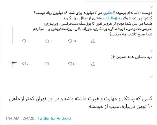 همین آقا در جواب واکنش به حقوق 16 میلیونیاش نوشته است:« اگر در تهران کمتر از ۱۰میلیون درآمد دارید؛ پشتکار و غیرت ندارید!"»