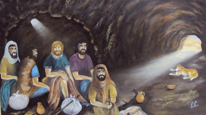 آنها که در دل کوه و در غاری پنهان شده بودند برای اینکه بدانند بعد از فرارشان از دست دقیانوس امپراتور روم در چه وضعیتی قرار دارند، یکی از خود را راهی شهر میکنند تا هم کسب اطلاع کند هم غذایی بخرد.