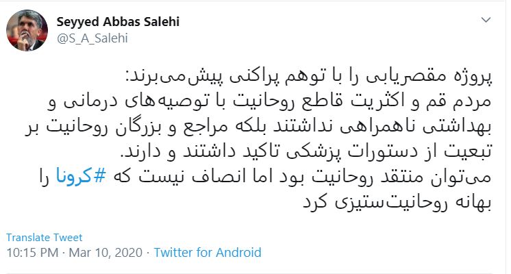 به گزارش ایلنا، سید عباس صالحی با در توئیترش نوشت: پروژه مقصریابی را با توهم پراکنی پیشمیبرند:مردم قم و اکثریت قاطع روحانیت با توصیههای درمانی و بهداشتی ناهمراهی نداشتند بلکه مراجع و بزرگان روحانیت بر تبعیت از دستورات پزشکی تاکید داشتند و دارند. میتوان منتقد روحانیت بود، اما انصاف نیست که کرونا را بهانه روحانیتستیزی کرد.