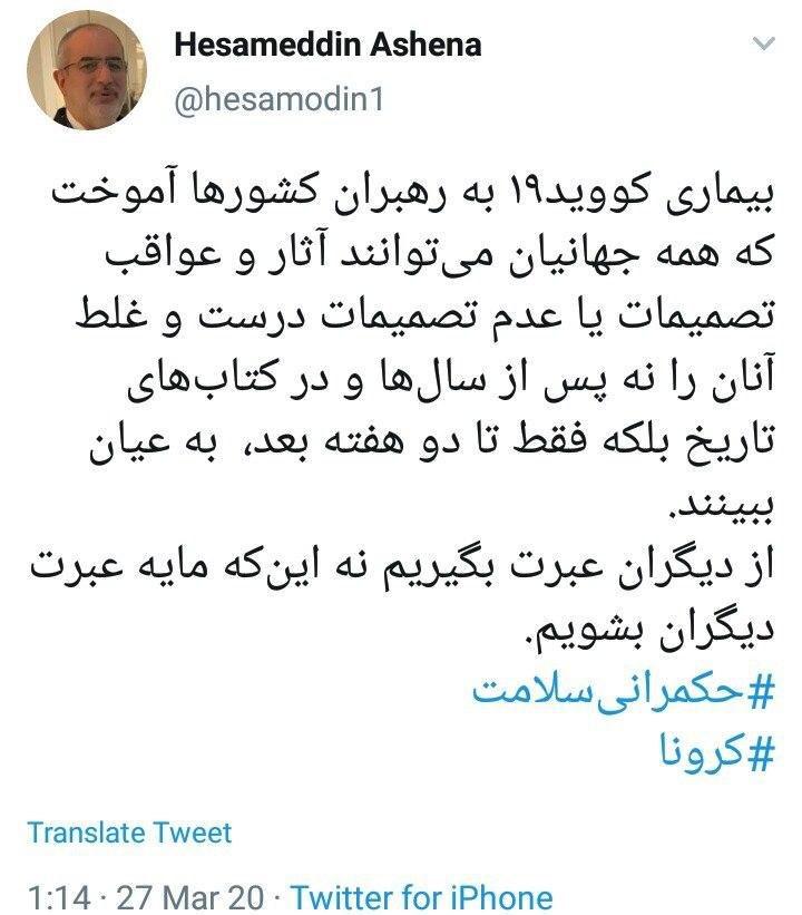 مشاور رییس جمهور: از دیگران عبرت بگیریم نه این‌که مایه عبرت دیگران بشویم