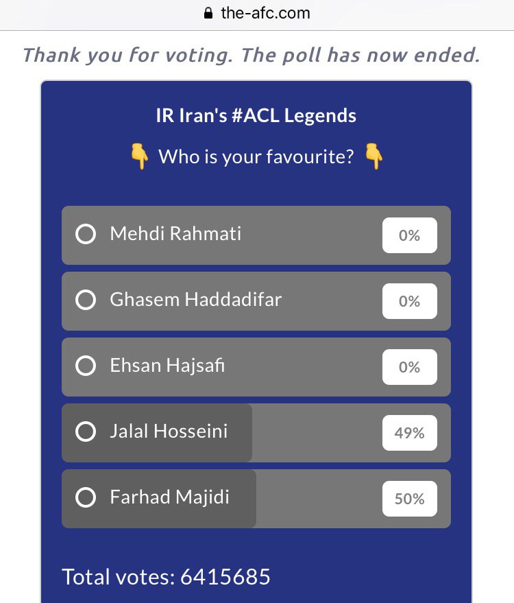 بیش از شش میلیون و چهارصد هزار نفر در این نظرسنجی کنفدراسیون فوتبال آسیا شرکت کردند که در اتفاقی جالب، حاج صفی، رحمتی و حدادی فر رایی به دست نیاوردند! فرهاد مجیدی که پنجاه درصد از آرا و یک درصد بیشتر از حسینی مورد علاقه مخاطبان این قرعه کشی حضور داشت توانست در رقابتی نزدیک این عنوان را به دست بیاورد.