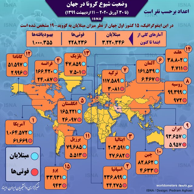 این روزها تقریبا تمام کشورهای جهان درگیر شیوع ویروس کرونا شده‌اند و تعداد مبتلایان به این ویروس در جهان، تا صبح پنجشنبه (۱۱ اردیبهشت) از مرز سه میلیون و ۲۲۰ هزار نفر عبور کرده و تعداد قربانیان این ویروس نیز از ۲۲۸ هزار نفر بیشتر شده است. در بین کشورهای جهان از نظر تعداد مبتلایان، آمریکا در رده اول و اسپانیا و ایتالیا در رده‌های دوم و سوم هستند و ایران هم هم‌اکنون در رده نهم قرار دارد. در این اینفوگرافیک، آمار ۱۵ کشور اول جهان و تازه‌ترین آمار کلی جهان درمورد کووید-۱۹ را مشاهده می‌کنید.