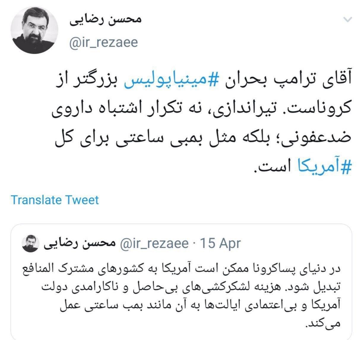 محسن رضایی: آقای ترامپ بحران مینیاپولیس بزرگتر از کروناست