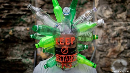 کارشناسان بهداشتی و پزشکی به همگان گوشزد میکنند که رعایت فاصلهگیری اجتماعی در دوران کرونایی ضروری است. در این عکس یک هنرمند فیلیپینی با درست کردن ماسکی از بطریهای پلاستیکی همزمان خواهان دور نگهداشتن ویروس کرونا و دیگر انسانها است.